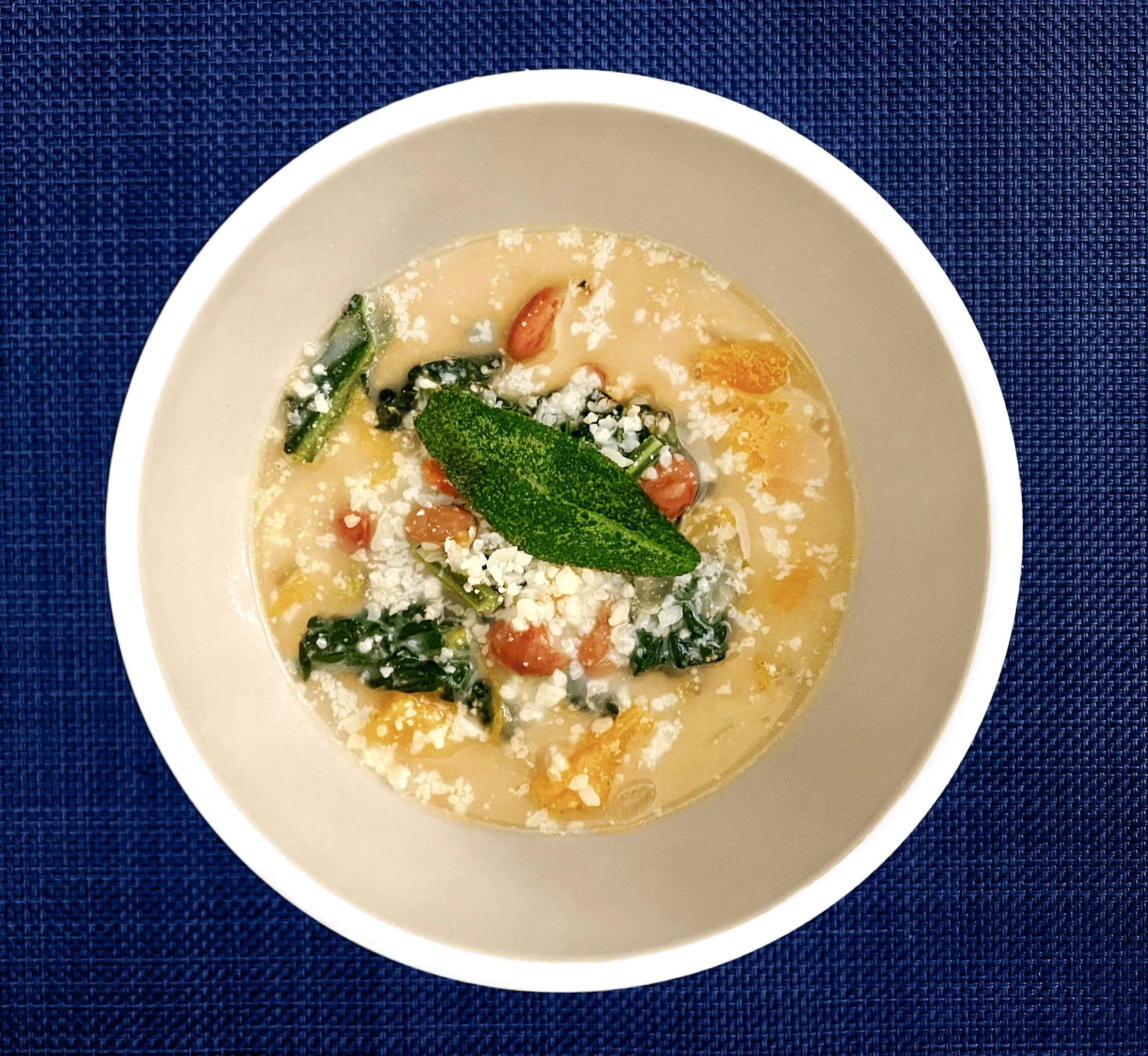 Stir in Parmesan, then ladle the soup into soup bowls and top with more cheese, a sprinkle of pine nuts, and crispy sage.